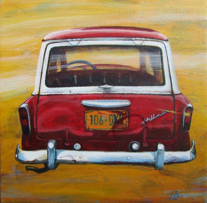 PaintingsLil’ Hillman August 5, 2011 sliderarts Introducing… …my smallest car painting yet. This cutie pie is a 1960 Hillman and 10 x 10 inches. I spotted this car in the Croton-Harmon train station parking lot. Share this: Share on X (Opens in new window) X Share on Facebook (Opens in new window) Facebook Share on LinkedIn (Opens in new window) LinkedIn Share on Pinterest (Opens in new window) Pinterest More Share on Reddit (Opens in new window) Reddit Like Loading... Related Published by sliderarts View all posts by sliderarts