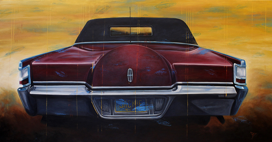 One of our favorite haunts in Peekskill just got a kick ass car ass. “Jackie” (78×40 inches) was installed on January 7 and was followed on the 8th by a gathering of friends and locals to celebrate its unveiling. This painting was commissioned by the restaurant Gleason’s, located in downtown Peekskill, and was obviously inspired by the actor Jackie Gleason, who owned several Lincoln limousines.